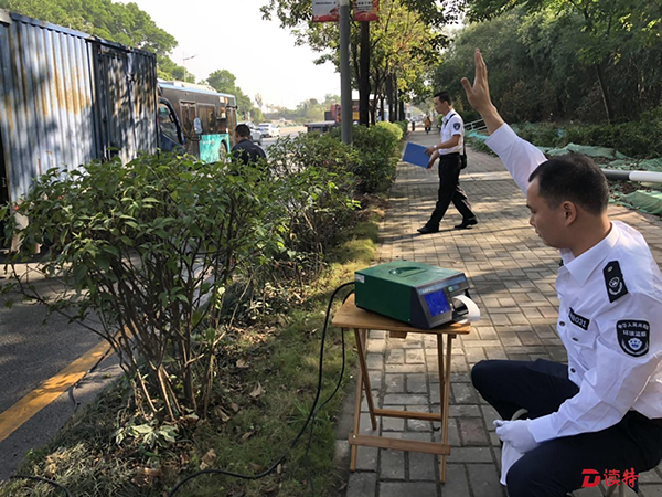 30日上午,记者随联合执法组来到龙华区观光路银星工业园路口。执法人员在这里布控设点,通过遥感检测和交警拦车检测两种方式,对过往的柴油车进行检测。记者看到,一辆蓝色中型货车被拦下,经现场检测,这辆车的尾气排放严重超标,交警现场对货车司机下发处罚决定书,对其罚款500元。