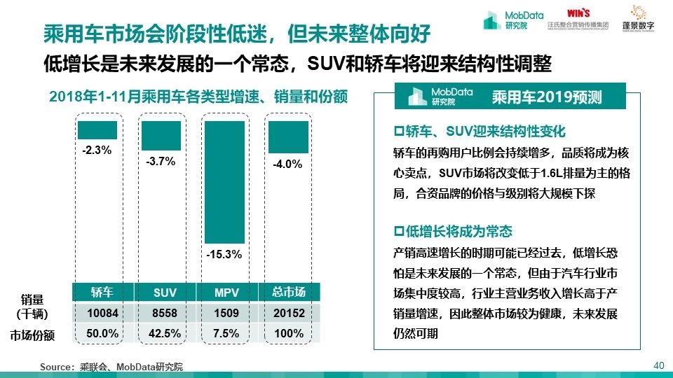 2.乘用车市场将发生结构性变革。2018年乘用车市场跌幅较大,随着SUV红利不再,难以延续市场“香饽饽”地位,轿车市场将有望重获青睐。