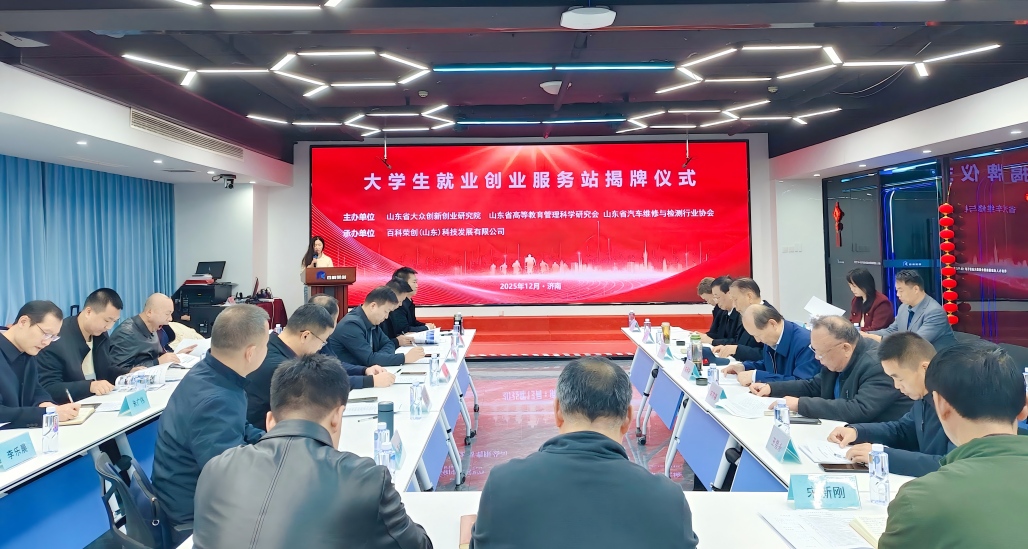 岁末寒冬藏春意,泉城大地涌新潮。12月 10日上午,由山东省大众创新创业研究院、山东省高等教育管理科学研究会、山东省汽车维修与检测行业协会联合发起的大学生就业创业服务站揭牌仪式,在济南市长清区大学城创新谷隆重举行。这一平台的正式落地,是深入贯彻党中央、国务院就业优先战略,深化教育链、人才链、产业链、创新链“ 四链融合 ”,破解青年就业创业结构性矛盾的创新实践,服务站以“人工智能+ ”作为创新创业的底层逻辑和核心驱动力,以“破解信息壁垒、激活人才价值、服务国家战略 ”为核心使命,通过数智化的一站式服务,推动高质量充分就业,破解“信息不对称、招聘效率低、精准匹配难 ”等核心痛点,服务政府、院校、企业、求职者四端,促进区域经济与产业升级。为人才培养与高质量就业创业服务体系建设和系统化、协同化发展提供了坚实的支撑。