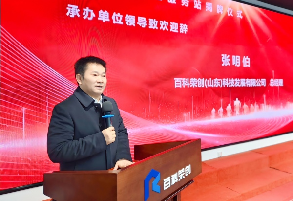 百科荣创(山东)科技发展有限公司总经理张明伯在揭牌仪式上致欢迎词。他表示,百科荣创深耕电子信息领域 20余年,已将济南列为全国产教融合服务基地之一, 目前已获批山东省产教融合型企业、山东省新一代信息技术公共实训基地,建有完备的教学实训场地与会议配套设施,可承接校企合作、产业学院共建、创新创业人才培养及各类会议活动,此前已为省内外多所高校提供人才培养支撑。服务站的成立,将搭建起高校与政府、企业、行业协会协同育人的战略桥梁。公司将以服务站成立为契机,深化实践教学与产教融合,为青年学子成长成才提供全周期、全方位支撑,全力助推服务站成为全省产教融合的示范标杆,持续为山东产业人才培育贡献力量。