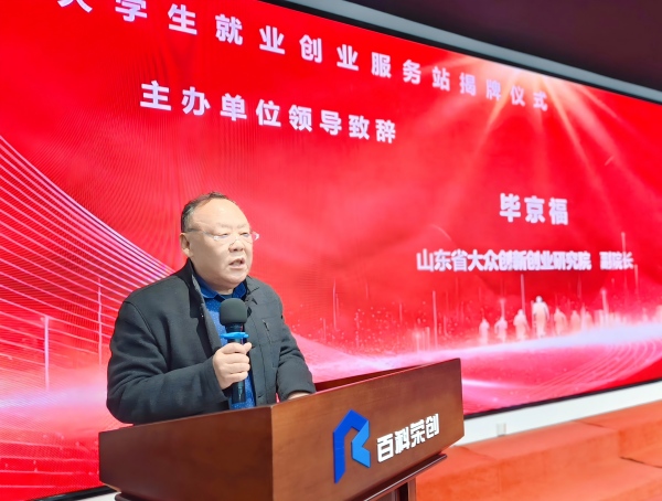 山东省大众创新创业研究院副院长、省人社厅就业办原主任毕京福在致辞中表示,当前,2025 届全国高校毕业生规模再创新高,山东省作为人口大省、教育大省、就业大省,毕业生预计达 89.8 万人,总量压力与结构性矛盾交织叠加,做好青年就业创业工作是支撑山东“走在前、开新局 ”,服务国家发展战略的关键举措。毕京福指出,服务站的成立是落实国家就业优先战略、深化“ 四链融合 ”的创新实践,核心在于打通校园与市场“最后一公里 ”,实现政策红利、产业需求、教育资源与学生期盼的精准对接。山东省大众创新创业研究院作为发起单位,以理论与实践的“转化平台 ”、资源与要素的“聚合平台 ”、人才与项目的“孵化平台 ”为核心功能,与服务站成立初衷高度契合。他期待,服务站能成为产教融合“新标杆 ”,构建青年发展“生态圈 ”,让山东成为青年人才创新创业的首选地;更希望广大青年学子将个人理想融入国家发展伟业,在关键战略领域勇挑重担,让青春在祖国最需要的地方绽放绚丽光彩。