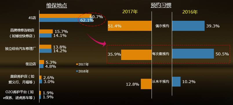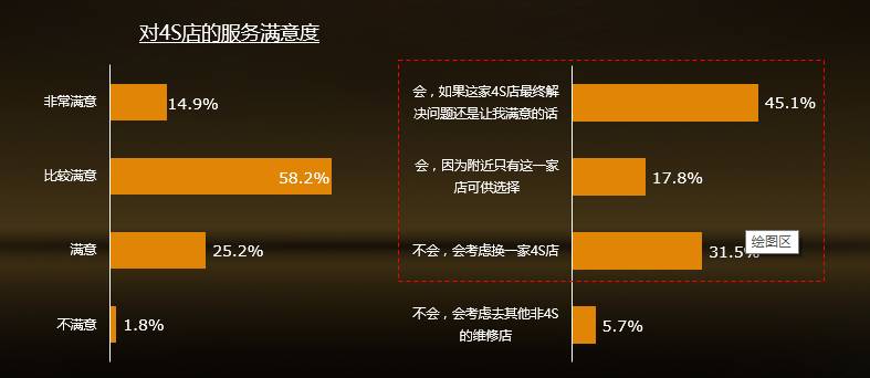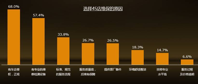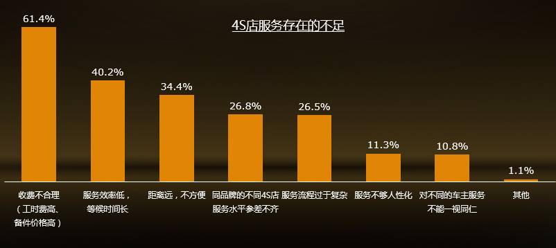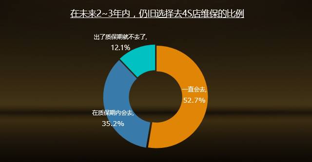 4S店依然是大多数车主给爱车做维修保养的首选场所;绝大多数车主对目前4S店体系的服务是满意的。可见4S店体系仍然是售后服务市场的绝对主导,优势明显。