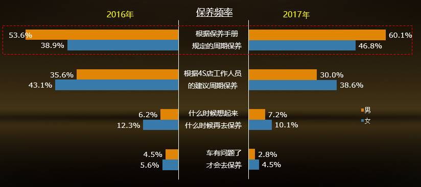 2、保养习惯 3、保养频率 4、保养频率对比分析 5、养车用车主要支出项 6、维保地点和预约习惯 7、选择4S店维保的原因 8、4S店服务存在的不足 9、未来2至3年选择4S店维保 10、对4S店的服务满意度 11、选择维保地点的考虑因素 移动互联对车主用车养车行为的影响 12、使用过的与用车相关的APP 13、使用频率及费用 14、车主对平台的选择 15、使用及不使用的原因 16、对用车问答类APP的关注点 17、用车遇到问题时向谁求助 18、经过求助后怎么办 19、未来用车养车的消费需求 20、未来生活和消费趋势的看法 建议 大数据要继续赋能于售后服务,未来的服务,需要更高效、更精准、更人性、更优质、更互联。 更广泛使用并持续升级数字化服务工具及平台,面对移动互联时代,全力构建符合未来车主消费行为及需求的服务流程与体系,让服务更省时、省钱、省心。 搭建更为多元化的能与用户充分沟通、互动的渠道,扩大与第三方平台的合作,通过多种途径与方式,保持与用户的多方位触点,不断提高服务响应速度,满足用户多样化需求。 加大线下与用户的沟通渠道和平台,重视“服务体验日/开放日”此类线下展示和互动活动,让用户通过实际感受和体验,加强对4S店体系核心优势的认知和认可。(今日后市场)