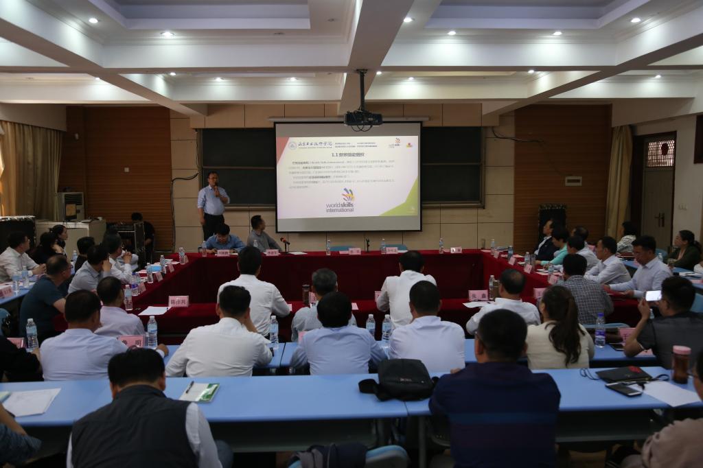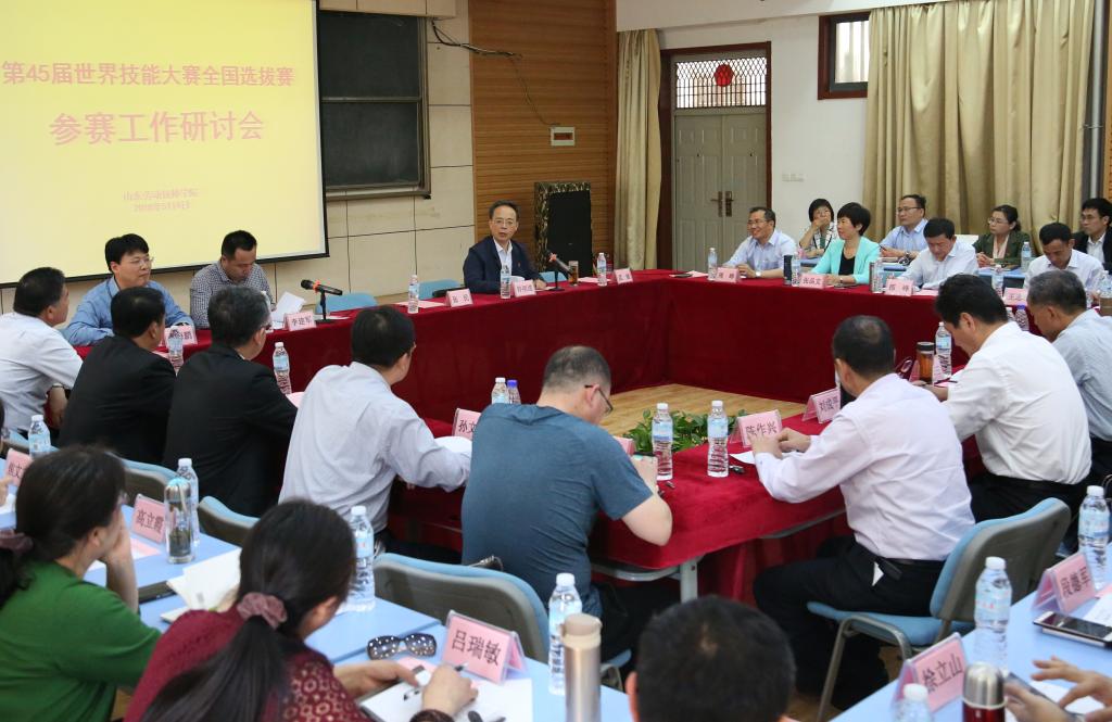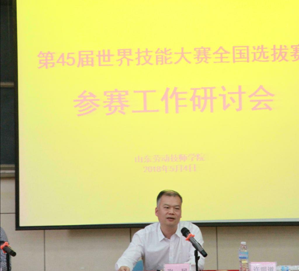 为积极备战第45届世界技能大赛全国选拔赛,学习研讨《竞赛技术规则》,由山东省人力资源和社会保障厅组织的第45届世界技能大赛全国选拔赛参赛工作研讨会于5月4日下午在学院长清校区召开,山东省人力资源和社会保障厅职业能力建设处调研员张民,副处长李建军,科长刘海鹏、武健,学院院长许明道、副院长周峥、教务处处长张丽芳,全省各技师学院、技工学校负责技能竞赛的领导和负责人参加会议。研讨会由李建军副处长主持。